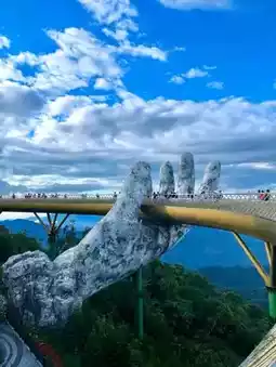 Relax on My Khe Beach, known for its soft sand and gentle waves. Visit the Marble Mountains for caves, temples, and panoramic views. The iconic Golden Bridge held by giant stone hands at Ba Na Hills is a must-see. At night, stroll along the Han River and watch the Dragon Bridge light up and breathe fire.