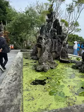 Besides the majestic halls and exquisite stone carvings of the Ngũ Hành Sơn Buddhist temple, there's a particularly moving sight: the Buddhist couplets in front of the pagoda.
