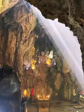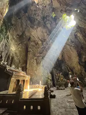 One of the highlights is the Huyen Khong Cave. The light streaming through the ceiling hole illuminates the Buddha statue, creating a divine scene that feels like a blessing from the heavens.