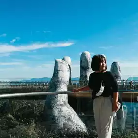 🌁🚊Atmosphere: Golden Bridge is a golden sky walk bridge built on a large palm. It stands out majestically and offers a beautiful view below. You can see the moving cable car. Since Golden Bridge is the first place where the cable car up to Bana Hills will stop, it is recommended to come up the cable car early in the morning at 7:00 a.m. (if you are not staying at Bana Hills) and stop by this spot first. There will not be many people yet and the light is beautiful. However, if you come a little later, there will be a lot of tourists and it will be very crowded in the afternoon from 3:00 to 4:00 p.m. You can come to take pictures from the first trip at 7:00 a.m. until the last trip at 7:30 p.m. We arrived early in the morning and the weather was very cool. We saw 3-4 couples taking pre-wedding photos. There are also beautiful walkways around the bridge for taking photos.