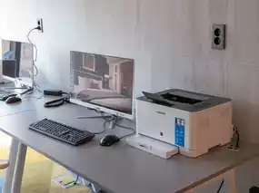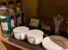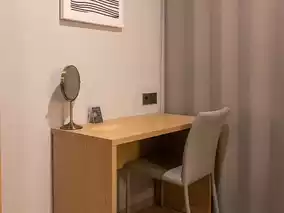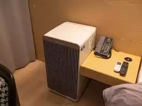 The room was modern and clean, with a king-size bed, a side table, and a desk, and it was equipped with a Samsung Bespoke air purifier and an air dresser, so it was good to use