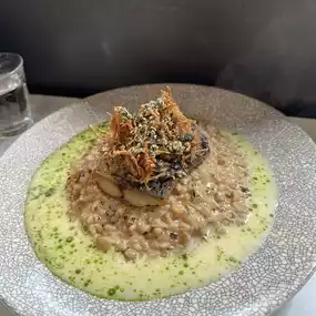 The risotto came with grilled fish and they poured green sauce on it at the table😳