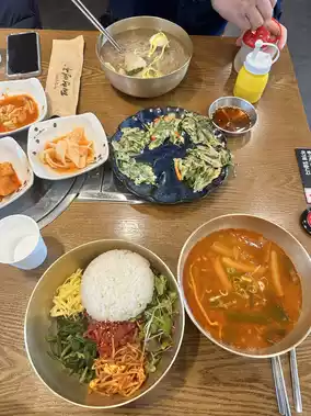 My husband ordered mul naengmyeon, and I ordered yukhoe bibimbap, and the yukhoe bibimbap came with yukgaejang soup. I don't like Yukgaejang, so I gave the soup to my husband, and after he ate about 2/3 of the cold noodles, he ordered me toss and plain rice, so we finished the Yukgaejang and rice deliciously. I finished the cold noodles left after eating Yukhoe Bibimbap, so it was very delicious and filling.