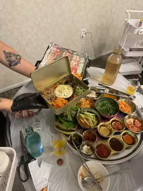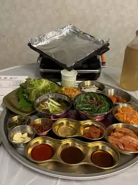 After ordering and waiting a short while, a large platter of various side dishes and sauces perfect for pairing with the meat is served!