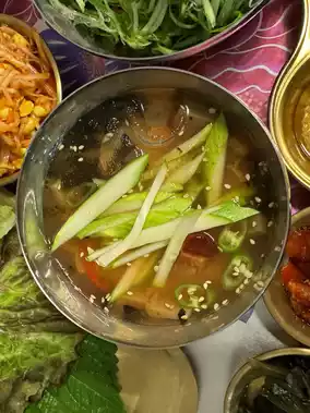 Because it's summer, they replaced the soybean paste stew with cucumber muksabal (a cold noodle soup), which is a true summer delicacy.