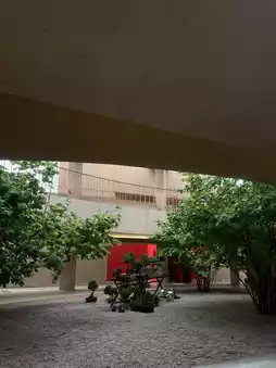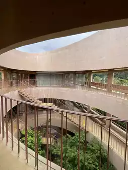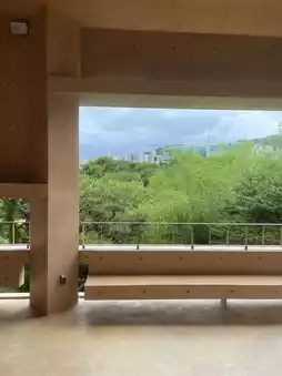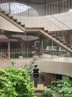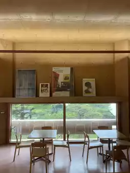 In the middle of the oval or donut-shaped cafe building, there are stairs that blend with the trees and sunlight, giving off a mysterious vibe like in Spirited Away. If you take a picture of someone standing on the stairs from the opposite railing, you'll get a perfect shot. The interior is also beautifully minimalistic in brown tones.