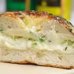 Chive cream cheese, basil tomato, bagel sandwich,