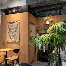 The interior is all wood-like, and there are potted plants, creating a relaxing atmosphere🌿