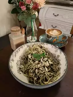 I couldn’t resist ordering their homemade pesto spaghetti. The dish was bursting with flavor – the pesto was creamy, rich, and perfectly balanced with fresh herbs. The addition of sunflower seeds gave it a nice crunch, making every bite delightful. Pairing it with their signature hot latte was the perfect choice. The latte came in the most beautiful floral cup, and the taste was as good as it looked – smooth, aromatic, and comforting.