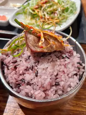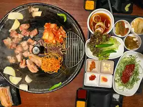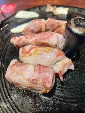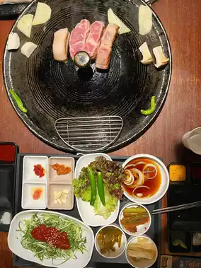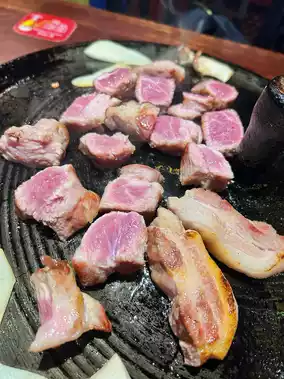 There is a dedicated barbecue service. The meat is thick and juicy. Although the pork belly is fatty, it is delicious when paired with vegetables and is not greasy. It will definitely fill you up if you pair it with rice! You need to order rice separately.