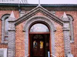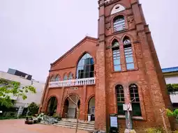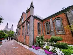 🔴Must-Visit Highlights: Stained glass windows, red brick exterior, garden plaza.