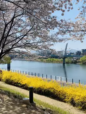 But on the second day, I woke up early and took a nearly two-hour KTX ride to Daegu. I casually strolled to a riverside park, and wow! The people here are so lucky to see cherry blossoms every day!