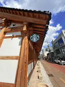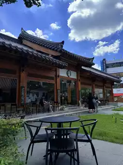 Complementing the historic ambiance, the Starbucks here offers items with a Korean touch, such as thermos cups inspired by traditional shell-inlay craftsmanship. These items exude a distinctly Korean aesthetic. While food isn't highlighted in this description, the location also features adorable limited-edition cakes.