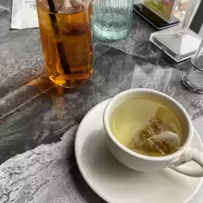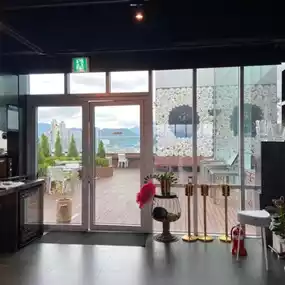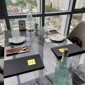 The interior is beautiful, and the table and cutlery complement each other perfectly. The large windows add to the ambiance.