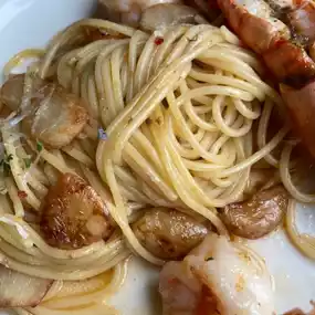 The Gambae Oil Pasta is spicy and delicious, with just the right amount of seasoning. The risotto is also great! The course menu includes a variety of dishes, making it a great value. Genoa is a great place with a great atmosphere!