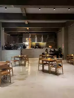 The clean gray exterior, wood-toned furniture filling the interior, and the wood fire grill that is constantly burning are eye-catching spaces!