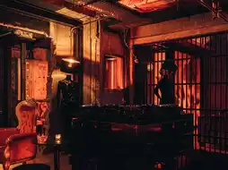 📸 Photo Spot: The wooden bar table with a whiskey bottle display in the background!
