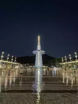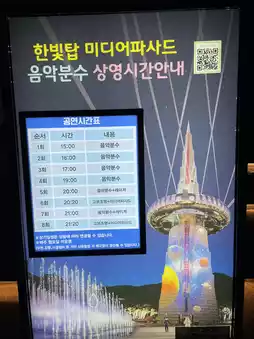 Even on hot evenings, you can beat the heat at Hanbit Tower Plaza in front of the Expo Science Park. Here, the musical fountain and dazzling lights brighten up the night. In front of Hanbit Tower Plaza, there's a shallow pool of water, making it a great spot for walking on water or for kids to play and splash around.