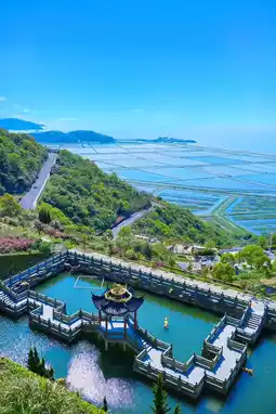 Not only is this the highest mountain on Qiushan Island, but it is also the sister mountain of Putuo Mountain. The Jade Buddha Pagoda on the mountain stands like a sharp sword at the summit of Guanyin Mountain. From the top, you have a broad view, and the salt fields are in sight.