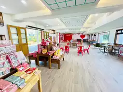 The store is spacious and comfortable, offering seating for travelers to rest.