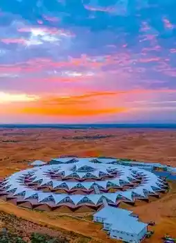 Lotus Sand Resort Island features the Lotus Hotel, known for its eco-friendly design. The hotel offers an all-inclusive package covering accommodation, dining, and most activities within the scenic area. Viewed from above, the hotel looks like a "white oasis" deep in the desert, a true paradise.