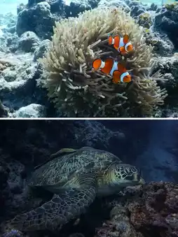 The bay in front of the dive shop is home to sea turtles, which rest and dine here every day, hence the name Turtle Bay. From the dive shop, you can see a large area of underwater grassland, with green seagrass gently swaying with the current. There are various underwater creatures in the grass, such as sea dragons, sea hares, various fish, and large sea turtles enjoying their meals.