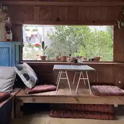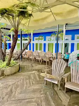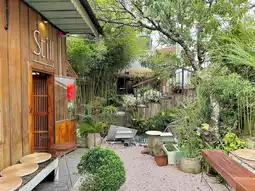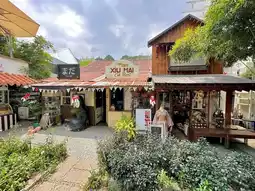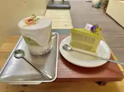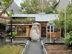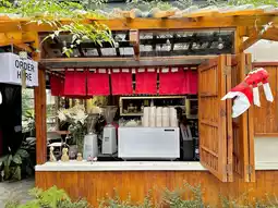 ☕️ It is a cafe with many small shops together, including a dessert shop, a coffee shop, a restaurant, and a souvenir shop. The decoration here is in a Japanese style, such as a wooden sign for writing your name and hanging it in front of the shop, with Japanese cartoon characters and Japanese shop signs. Each house is made of many small wooden houses with zinc roofs, sharing a common area, such as: You can buy from this shop and sit anywhere in the common area of the shop.
