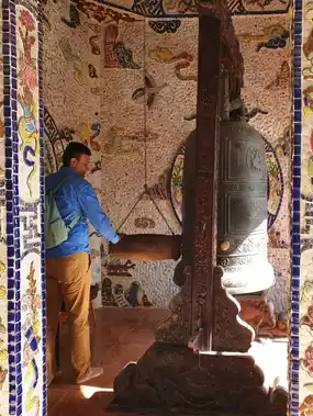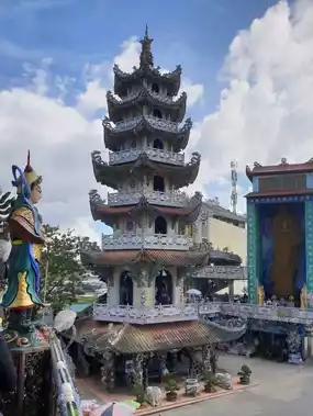It is one of the most famous and uniquely designed pagodas in Dalat with fine carvings of porcelains and giant structures. The temple campus is quite large, with different areas such as the main hall, the Buddha statue with flowers, the wood display area, and 18 floors of hell. The first thing that catches visitors' attention is the 37-meter-tall bell tower, which is considered the tallest one in Vietnam.