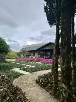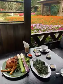 As you step inside, you’ll be captivated by a vibrant flower garden bursting with colors and plenty of unique photo opportunities. We ordered a serving of grilled chicken with bamboo rice and a plate of wild vegetables, perfect for two. The chicken was rich and succulent, bursting with flavor, while the bamboo rice was delightfully sticky and aromatic. The wild vegetables were fresh, crisp, and a perfect complement to the meal.
