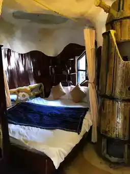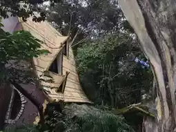 Crazy House features an exterior designed to resemble a giant tree, with rooms themed around animals and nature. For instance, the Tiger Room includes a sculpture of a tiger with red eyes, while the Kangaroo Room has a kangaroo sculpture. The interiors are characterized by curves and irregular structures, offering a completely unique atmosphere compared to typical hotels.