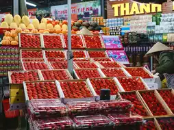 There are a lot of food items, including clothes, snacks, and fruits. There are clothes for sale on both sides of the road. The prices are not expensive, only a few hundred baht. Each shop is the same. If you want to bargain, you can buy the cheapest shop. As for food, there are grilled menus, lots of fruits, strawberries, and avocado yogurt. It goes very well with Vietnamese pizza. The market is in the city center, not far from the accommodation. You can walk around and relax.