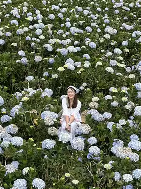 It features vast fields of blooming hydrangeas in shades of blue, purple, and white, perfect for photography and sightseeing📸