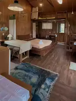 The homestay features an outdoor relaxation area, with decorative lighting at night and a bonfire for socializing and sharing experiences with fellow travelers. Alternatively, guests can cycle or hike to enjoy the surrounding nature.