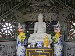 🌕 Golden Guanyin statue, inside the building with intricate patterns.