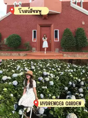 🌻 Hydrangea Flower Garden. The entrance fee is 60 baht per person. We walked around and took pictures for about an hour. There were many beautiful corners. The purple and white flowers were in full bloom. It was very beautiful.