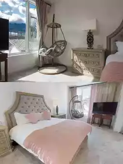 As soon as I entered the door, I saw a small yard full of lovely succulents, a flowering pomegranate tree and gorgeous bougainvillea. The room was also very clean and equipped with a disposable toilet seat. When I went there, the sun was shining in through the French windows. It feels so good