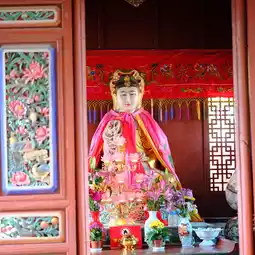 Inside the temple is beautiful, peaceful, and cool. There are statues of Guanyin for worship at intervals.