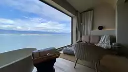 5, Six Read · Sea Oriental has 13 rooms, each with sea view floor-to-ceiling windows. We stayed in the Yuehai Premium Queen Room, which has a simple and warm design and excellent hardware facilities, including a Dyson hairdryer, a smart toilet, a tea kettle and a Beoplay Bluetooth speaker. In addition, there is a wealth of minibar snacks and cup noodles, chips, chocolates, and a free hot spring bath gift box.
