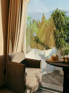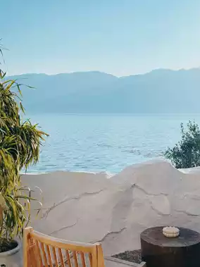 The first floor features a common area and café, while the basement level offers a seaside café spot and photo opportunities, exuding a "Santorini" vacation vibe by Erhai Lake. The rooms are designed in a creamy aesthetic with earthy tones, using natural wood materials, furniture, and greenery to create a cozy atmosphere 🍃