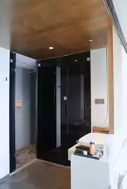 Dyson hair dryer, Marshall speaker, refrigerator, air conditioning, giant screen projector, bathtub🛁, King Koil mattress, Kohler bathroom fixtures, capsule coffee machine, safe, and Carnation bedding