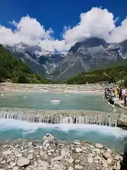 Starting at 6 AM from the hotel, head to Yunshanping, located within the Jade Dragon Snow Mountain scenic area. Yunshanping is a lush alpine meadow nestled halfway up the main peak of Jade Dragon Snow Mountain, hidden within dense spruce forests. On a clear day, you can catch a glimpse of the mountain’s main peak. Jade Dragon Snow Mountain, with an elevation of 5,596 meters, is often shrouded in mist and clouds, resembling a giant silver dragon from afar, hence its name. It’s said that not every visit guarantees a view of the snow-capped peak. By the time you leave, the area may already be enveloped in thick white fog. Next, visit Blue Moon Valley at the foot of the mountain, a dreamlike paradise where the crystal-clear blue waters of the lake offer a refreshing coolness.
