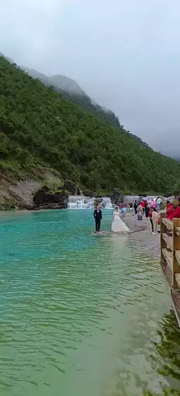 We first explored Lijiang freely, then ascended Jade Dragon Snow Mountain the next day. The summit stands at 4,506 meters above sea level, and we took a cable car up—it was freezing! Unfortunately, thick fog obscured the snowy peaks. Later, we visited Blue Moon Valley, with its gentle, pale waters, where some brave souls were even taking wedding photos despite the cold.