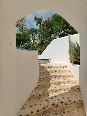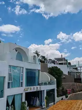 Stepping into Ideal State feels like an instant transport to distant Greece. Pristine white houses cascade down the hillside, each uniquely designed. The Dali Santorini Boji Scenic Hotel is a perfect example, featuring iconic white spiral staircases, arched doorways, and rooftop terraces that complement the blue skies and clouds, forming a pure and beautiful picture. Here, you can wander along meandering paths, surrounded by blooming bougainvillea and striking cacti, while feeling the warmth of sunlight glowing on the white walls.