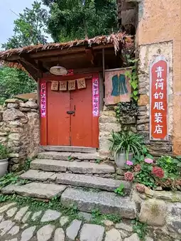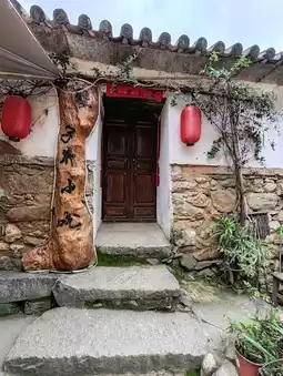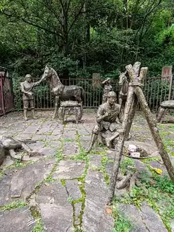 Walking along the ancient stone-paved road felt like stepping back into an era when caravans came and went, their bells jingling. The scenery along the way is filled with historical imprints—old houses built into the mountainside, stone walls, and wooden gates that speak of the passage of time. In front of a small clothing store, red couplets and a wooden signboard exude a rustic warmth, reflecting strong local character. Further along, an intriguing sculpture group vividly recreates a scene of a caravan taking a rest: people gathered around a campfire, some tending to horses, others resting. The lifelike statues almost seem to carry echoes of their conversations from long ago.