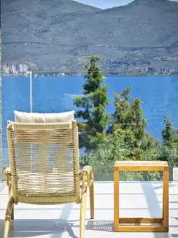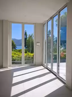 The extra-large panoramic floor-to-ceiling windows frame the entire blue lake,