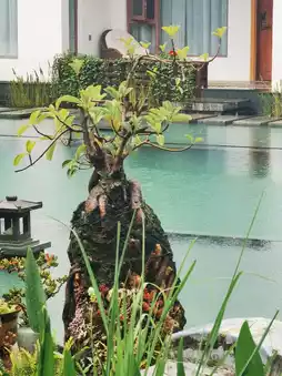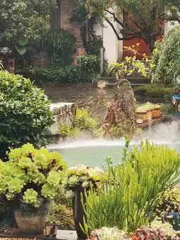 Stepping into the courtyard feels like entering a cross-cultural aesthetic scene blending Chinese gardens with Dali’s local charm: in the ancient stone mill water feature, a red flower gently sways with the raindrops, and the ferns are lush and vibrant, filling the rainy day with freshness🌿 The bonsai by the pond is robust and rustic, its roots intertwined with succulent plants, harmonizing with Japanese stone lanterns and misty water vapor, creating a “landscape painting in the rain” vibe with every snapshot.