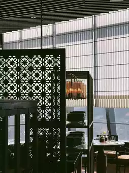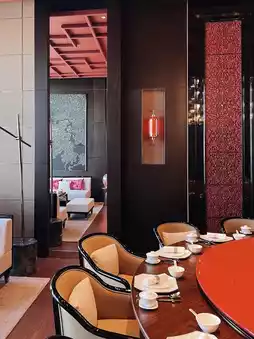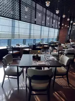 Saai Yue Heen, the signature Chinese restaurant on the 39th floor, specializes in modern Cantonese cuisine, serving handcrafted dim sum, traditional Chinese roasted meats, and Beijing jujube wood-roasted duck. The restaurant features an exhibition kitchen and display aquariums showcasing fresh local seafood.