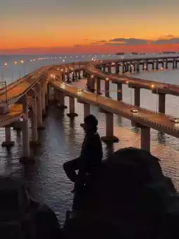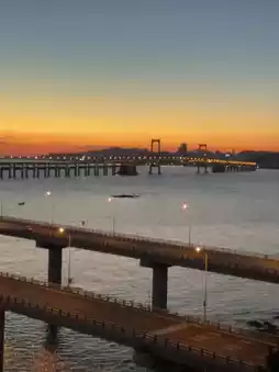 At dusk, the setting sun paints the bridge and the sea a golden orange. A gentle breeze caresses the bridge towers, reflecting them in the water. The shadows of boats and lights intertwine across the water, creating a magnificent and graceful scene. Truly breathtaking is the moment the bridge is illuminated at night. The cables and towers gleam in the light, and the sea is dotted with specks of light, creating a majestic and romantic scene as if the entire bridge is in dialogue with the stars.