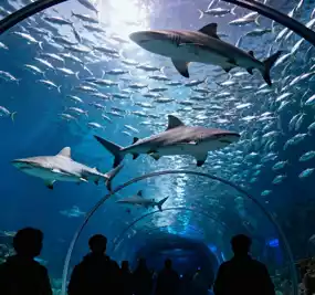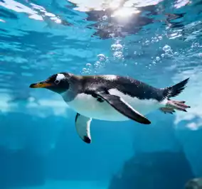 ➋ Capture the moment penguins swim overhead in the underwater tunnel