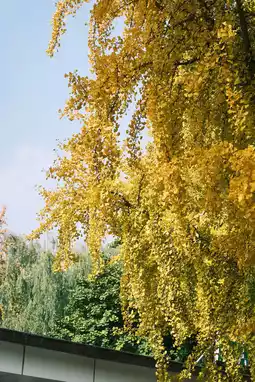 The ginkgo trees here are especially tall. Shooting from below easily captures a full screen of golden hues, and the playful slide in the foreground adds to the atmosphere.